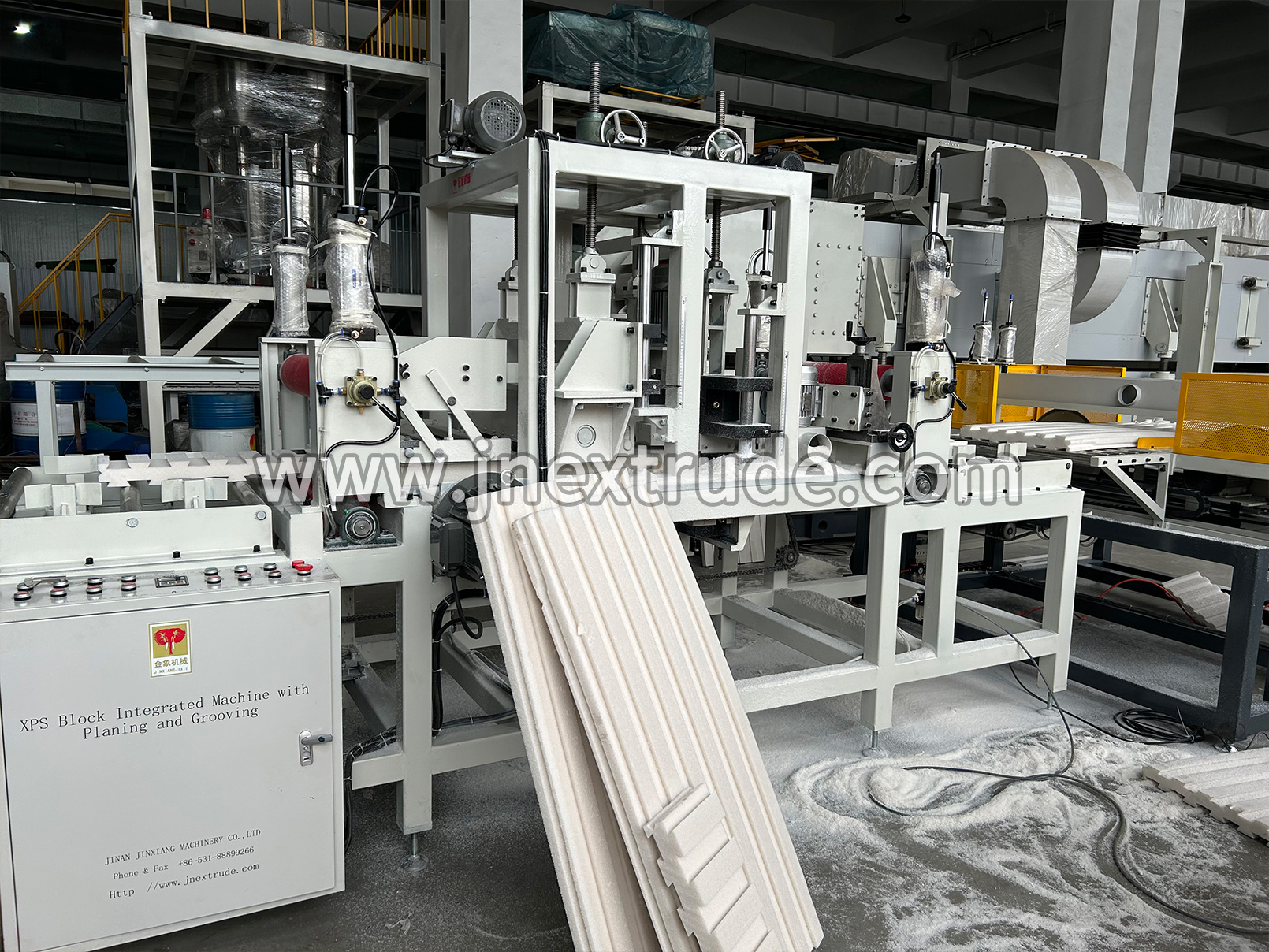 表面拉毛開槽機(jī)組采用機(jī)架、組合式合金刀頭、電機(jī)、氣壓裝置、滾輪適用于采用螺旋刀組將擠塑板表面去皮打毛,獲得所需要的表面結(jié)構(gòu)以確保板材的墻面附著力。利用高速旋轉(zhuǎn)鋸片在板材表面打磨出具有一定深度和寬度的雨槽,以增加其表面黏結(jié)性能。